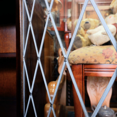 英国 アンティーク ステンドグラス オーク無垢材 ブックシェルフ 飾り棚 キャビネット リネンフォールド ヴィンテージ