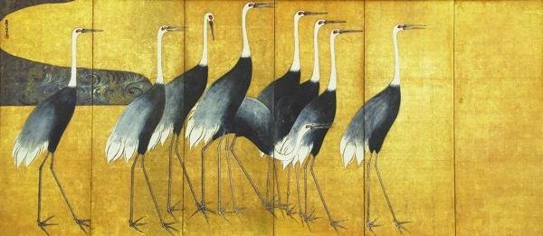 【真作】【WISH】尾形光琳「群鶴図(左隻)」シルクスクリーン 約12号 大作 振金 証明シール ◆出品中の群鶴図(右隻)と対 #23072894