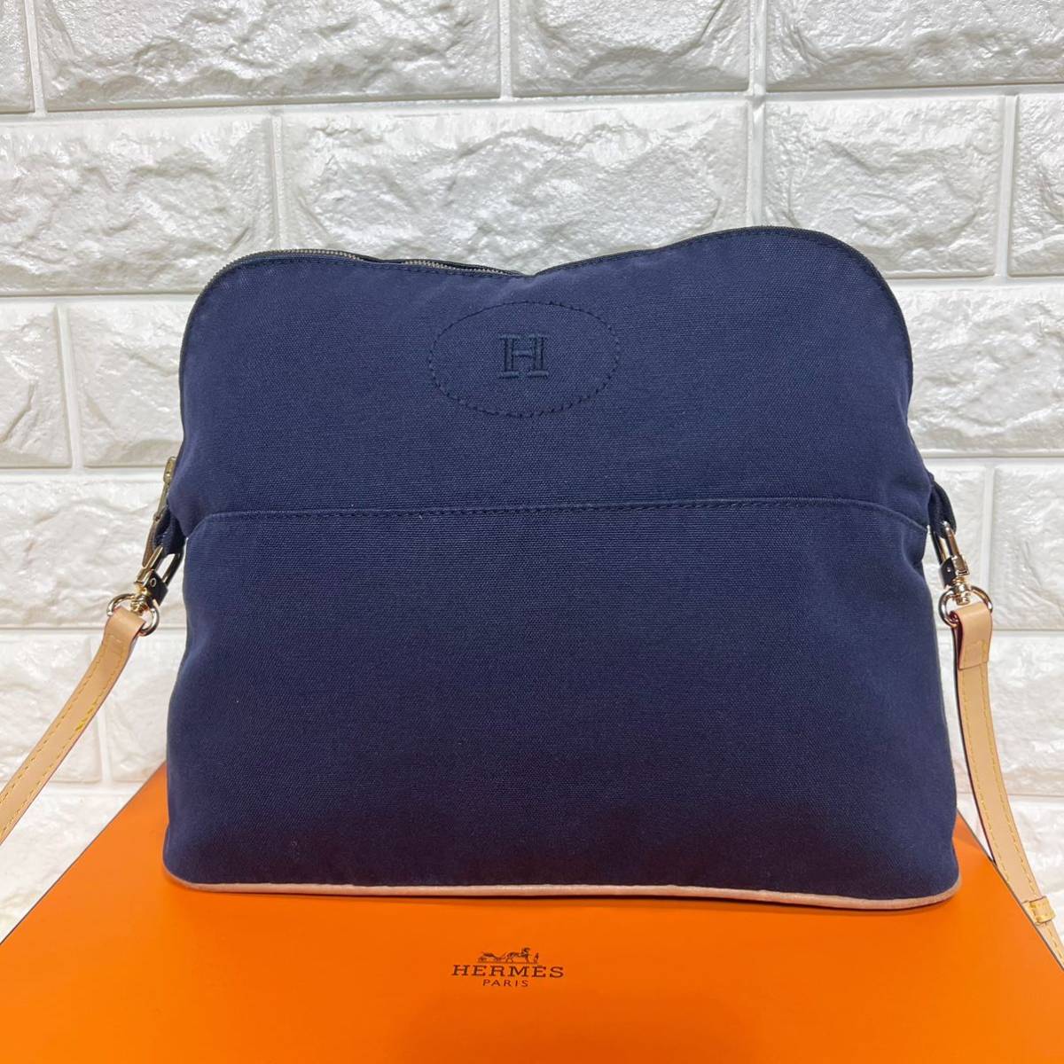 美品 HERMES エルメス ボリードGM35 2way ショルダーバッグ ポーチ バニティ H刺繍ロゴ ネイビー 紺 本革 コットンキャンバス 廃盤 希少